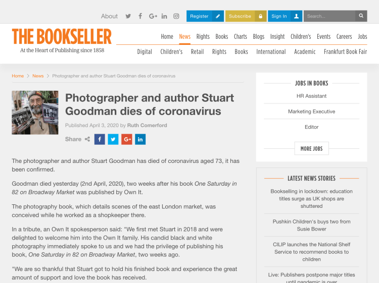 Tributes AboutTributesPhotos Some online tributes to Stuart The Bookseller Spitalfields Life Press Gazette OWN IT! Evening Standard Photo Archive News Eastern Daily Press Hackney Magazine